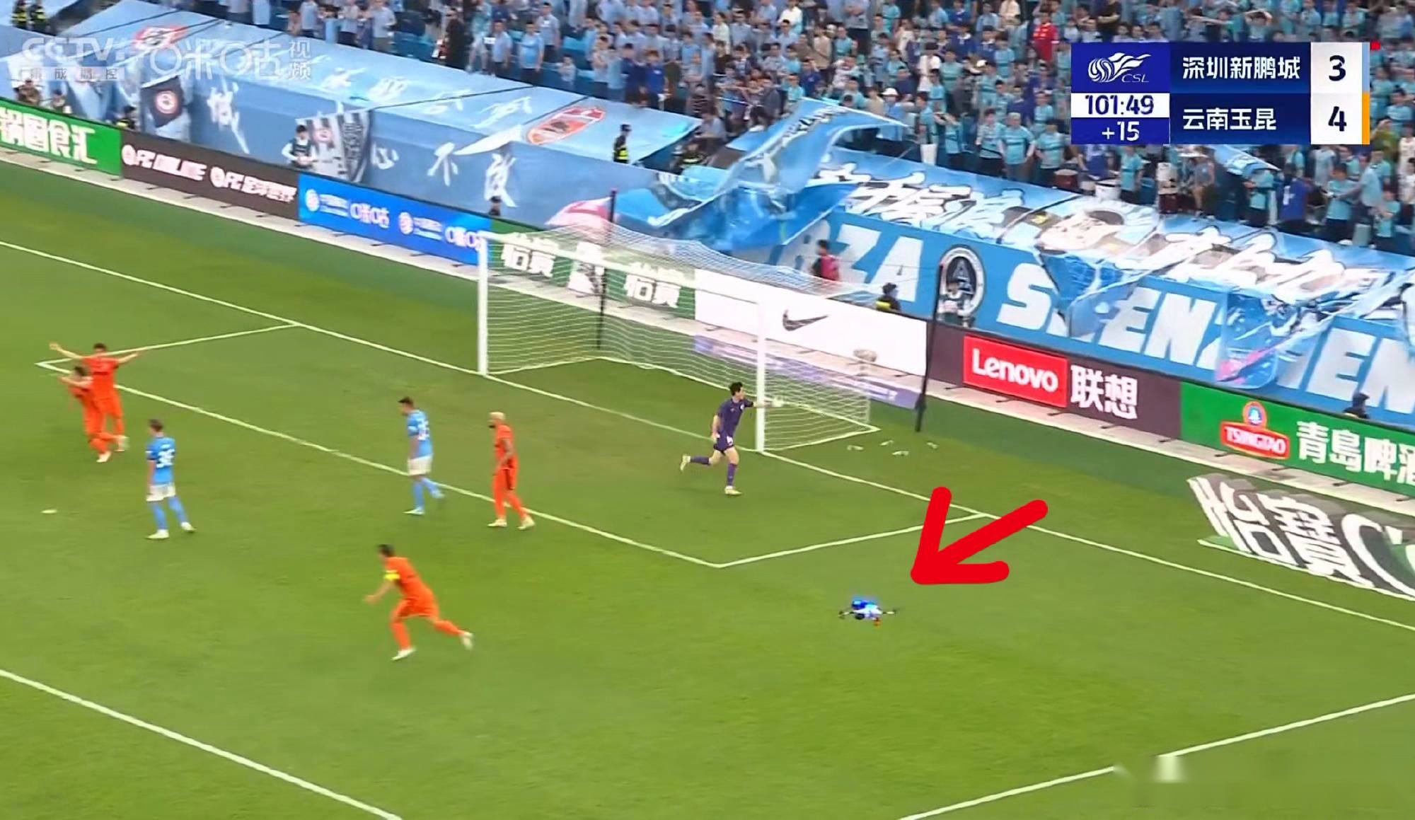 这架无人机在比赛第102分钟时出现在转播画面下方,并正巧被转播摄像机捕捉到。根据足协要求,当比赛进行时,赛场出现无人机时应中断比赛。但比赛裁判并未做出表示,比赛也照常进行。